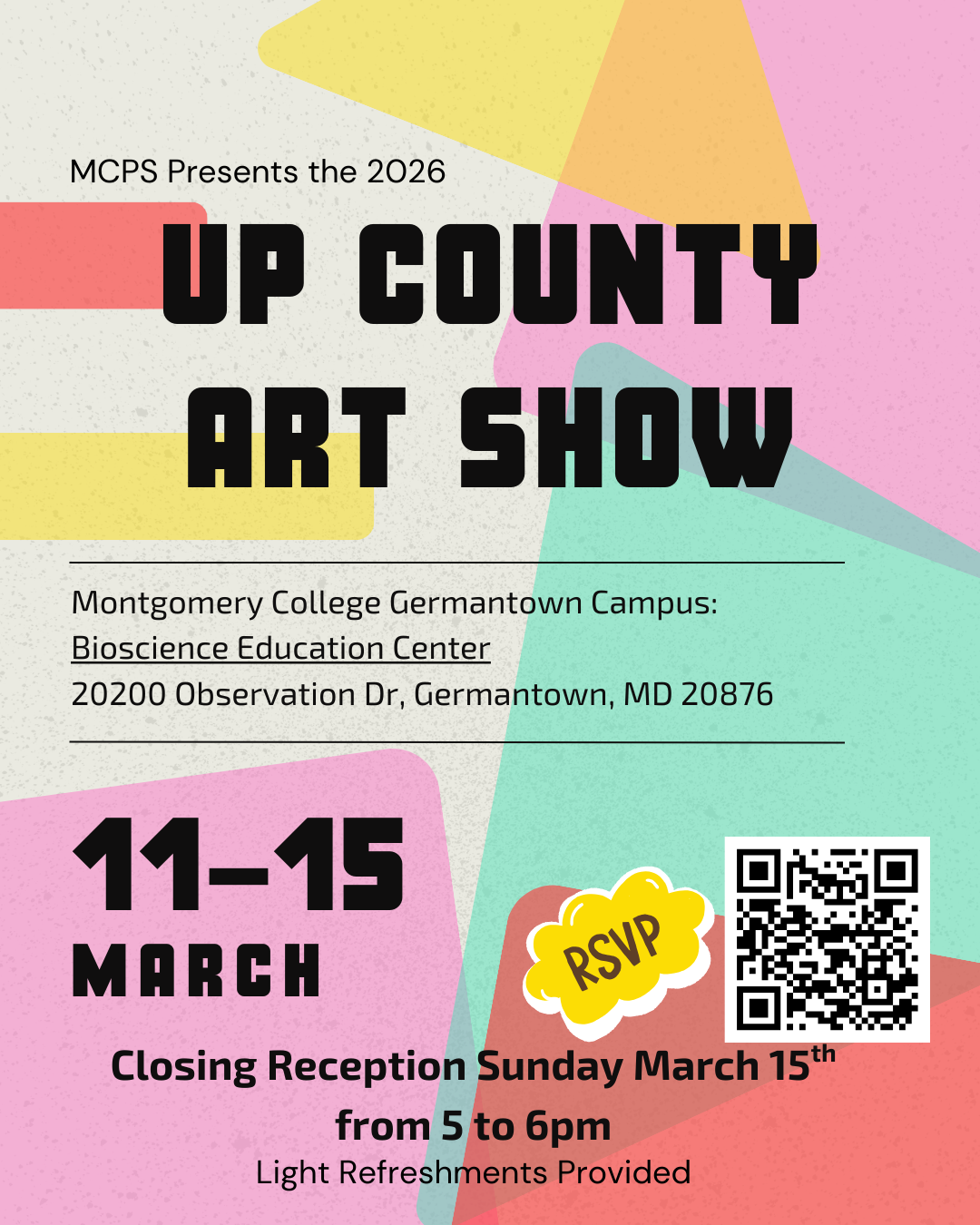 This year our county wide art show will be done by community. This format will allow elementary, middle, and high schools within a geographic area to showcase together creating an atmosphere for young artists to envision what their future may look like as they continue on in their arts classes in MCPS in addition to older artists being able to reconnect with past art teachers and view work from their younger siblings. Also new will be a closing reception held on the last day of each show.