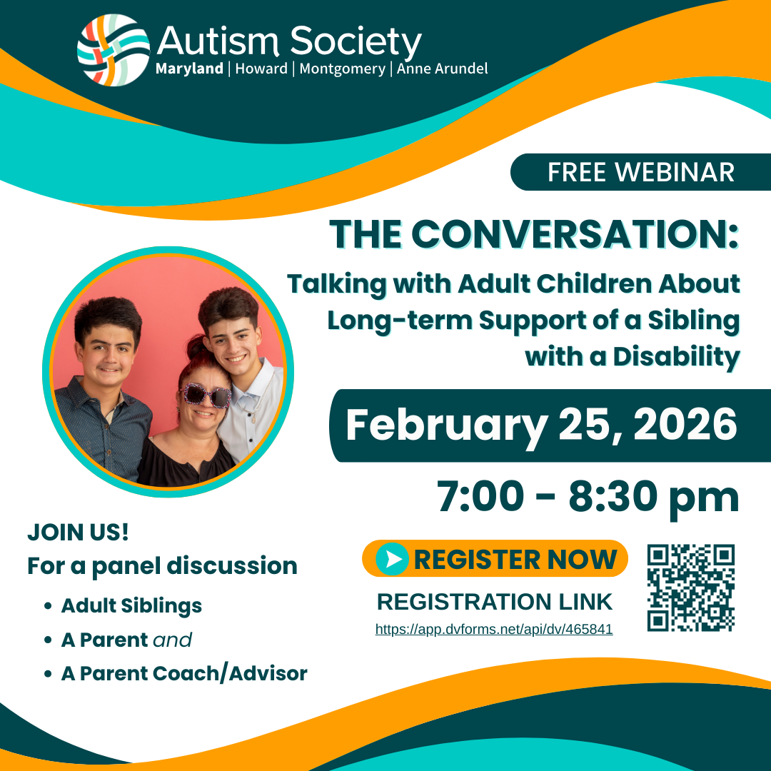 Talking with adult children about long-term support for a sibling with a disability can be challenging. This webinar brings together adult siblings, a parent, and a parent coach/advisor to share honest perspectives and practical guidance. Learn how to start these sensitive conversations, explore realistic roles over time, and move forward with clarity, compassion, and confidence - no matter what choices are made. Visit registration page. Sponsored by the Autism Society of Maryland