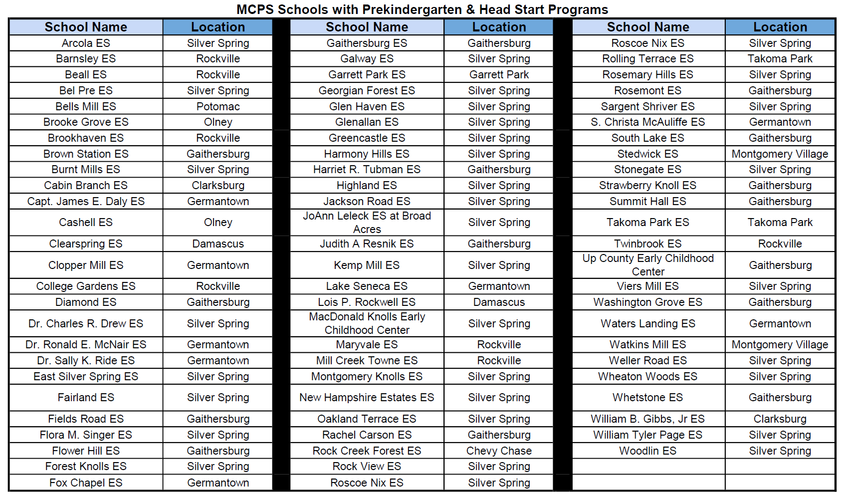 Montgomery County Public Schools (MCPS) Prekindergarten/Head Start programs and our Private Provider Partnerships provide a high-quality educational experience for income-eligible children in order to prepare them with the foundational knowledge and skills necessary for school success in kindergarten and beyond. MCPS offers part-day and full-day programs at schools across the county.