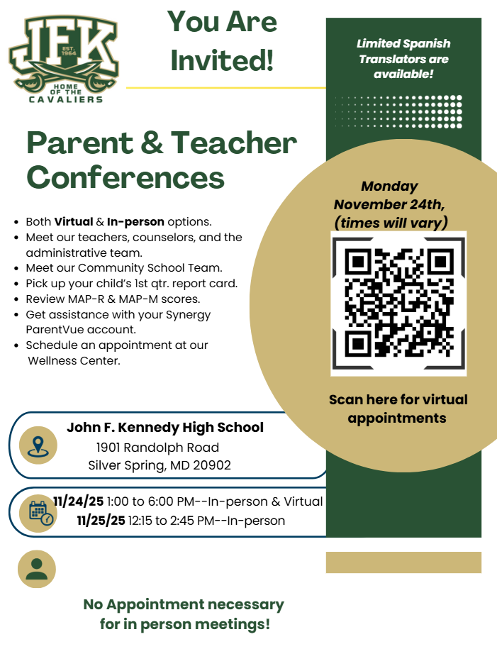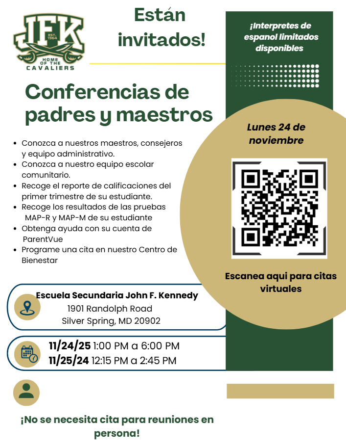 We invite all families to join us at Kennedy High School for Parent-Teacher Conferences on Monday, November 24, from 1:00-6:00 p.m., and Tuesday, November 25, from 12:15-2:45 p.m. This year, families may also request a virtual appointment. Please scan the attached QR code or use this link: https://forms.gle/kdrx7SDVnEw1eLyx6.