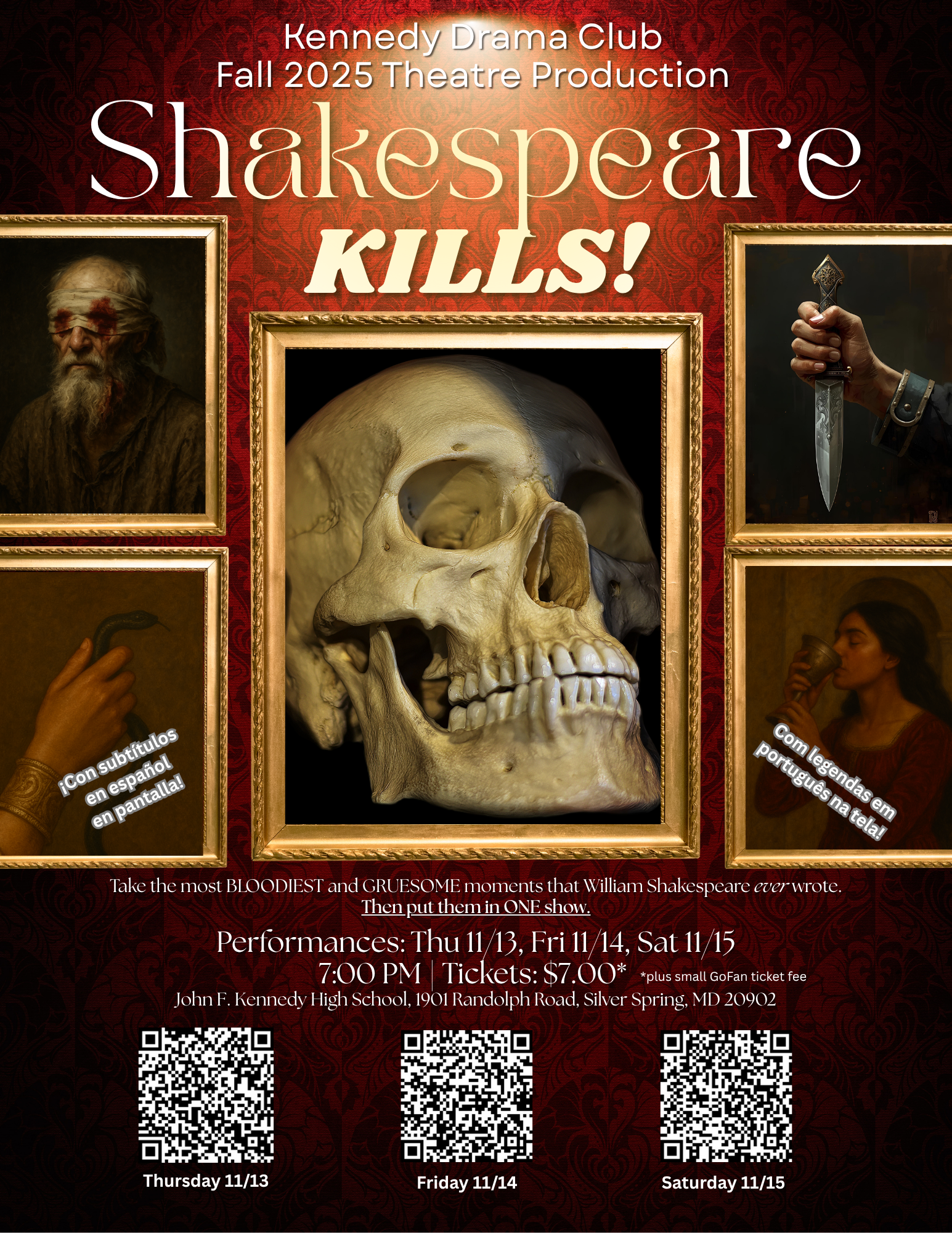 Shakespeare KILLS! is an original play that follows the exploration of Shakespeare by two teenage girls during the Elizabethan era. It contains some of the goriest, bloodiest, most action-packed scenes he ever wrote… but we make it FUN! (Really!) Clik here for tickets for Thursday the 13th, Friday the 14th and Saturday the 15th.