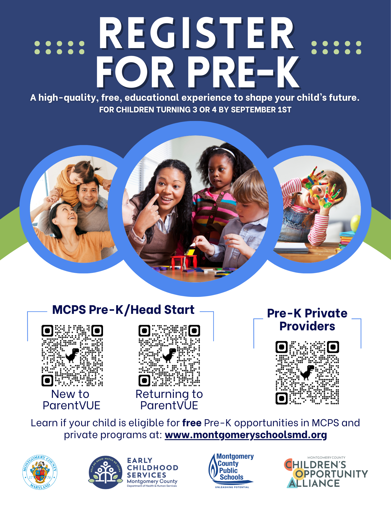 Eligible families can access free programs in both public schools and select private settings in Montgomery County. Entrance into an MCPS Prekindergarten/Head Start program is determined by age, income and residency. Families of children who will be 3 years old or 4 years old by September 1st may apply. Interested parents must do so through the MCPS ParentVUE app using registration information detailed below. In addition, families interested in learning more about how to apply for Montgomery County private provider partners may contact them directly. Our private provider partners operate independently and maintain a collaborative relationship with MCPS to deliver high-quality educational services and experiences.