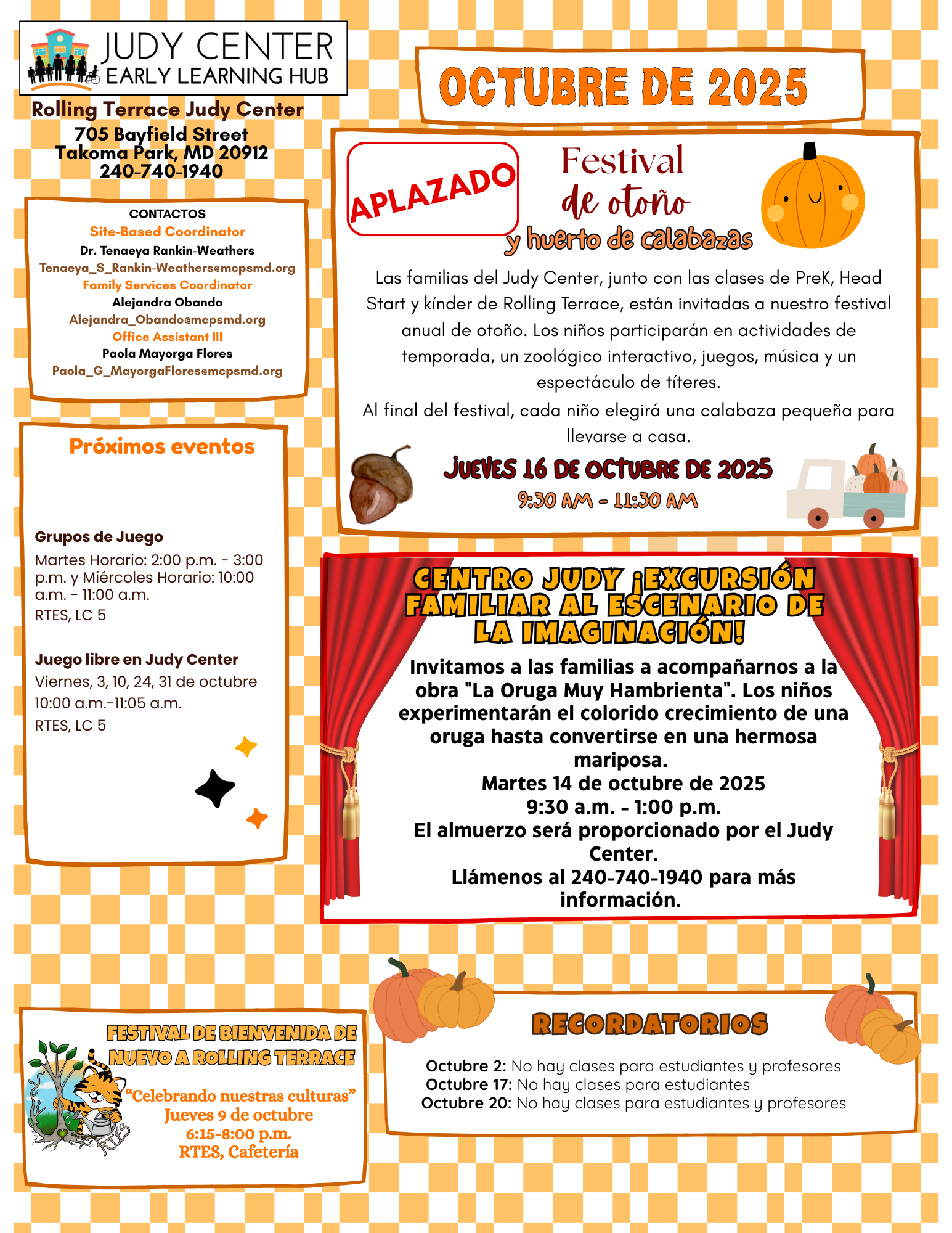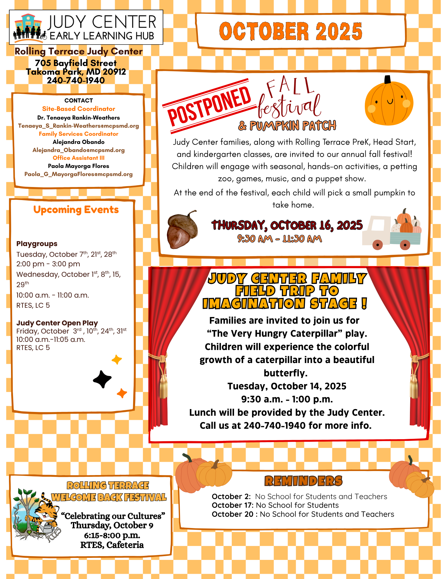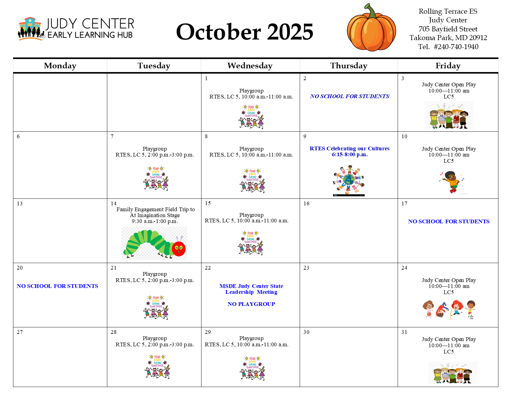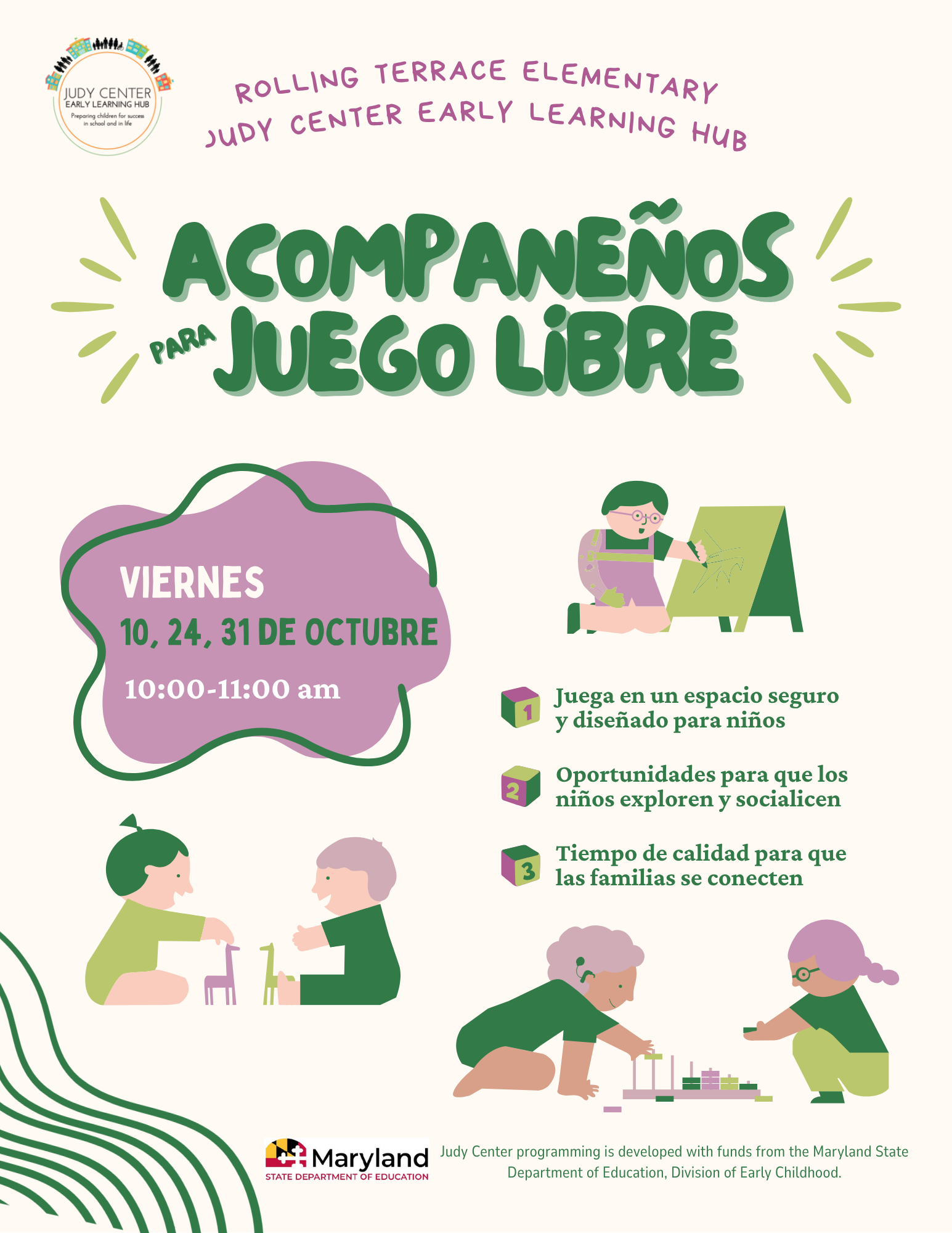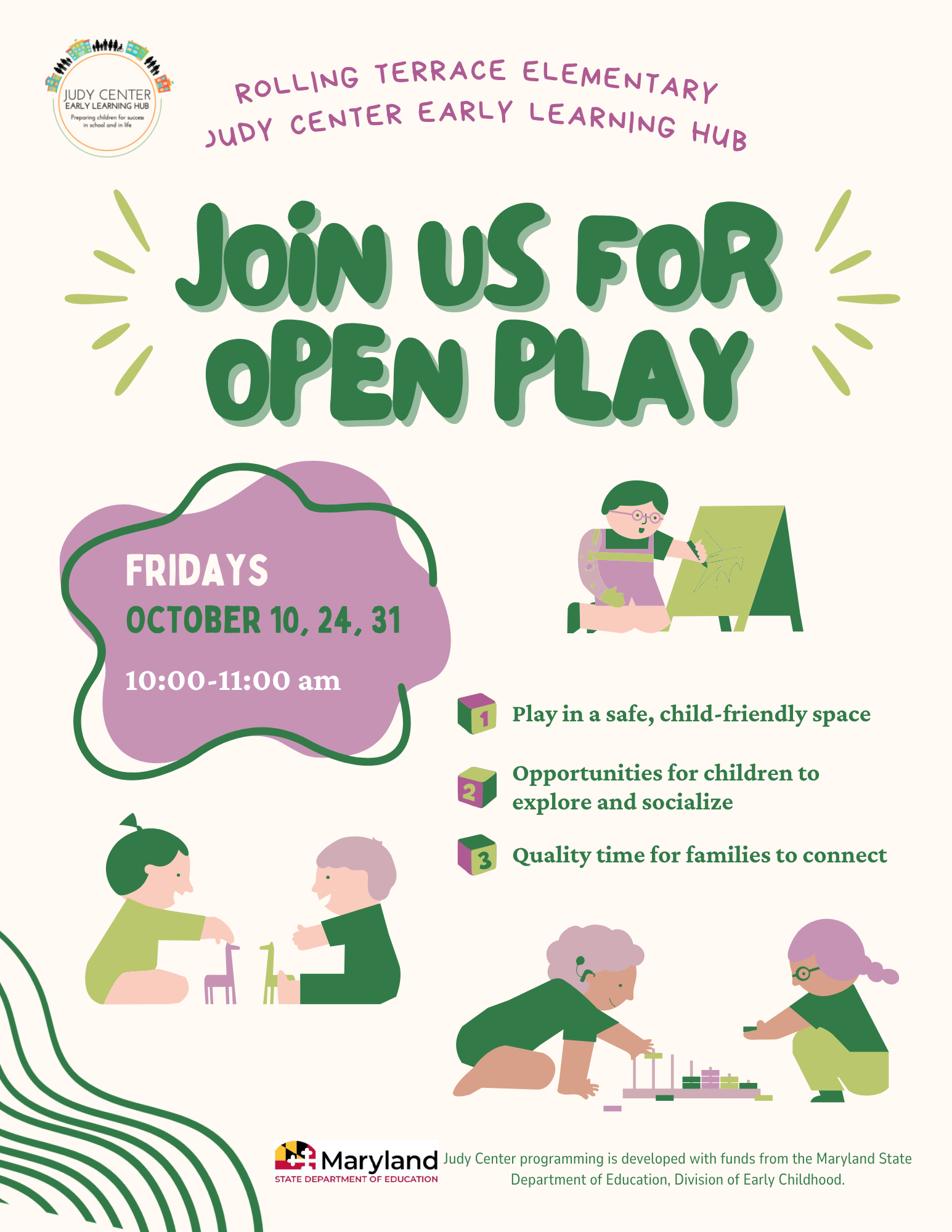 The Rolling Terrace Elementary School Judy Center Early Learning Hub serves young children and their families living in the RTES attendance area. As a part of Montgomery County Public Schools, we enlist the aid of our many collaborative partners to support school readiness for the whole family. For information about our programs, click here.