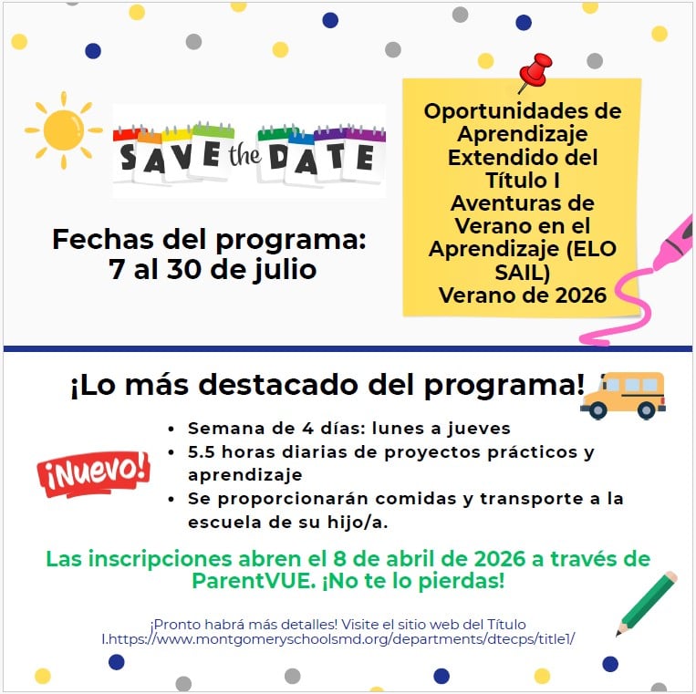 Extended Learning Opportunities Summer Adventures in Learning (ELO SAIL) is a 4-week summer program for rising K–5 students enrolled in Title I schools for the 2026–2027 school year. ELO SAIL will operate a four day program, running from Monday to Thursday each week. ELO SAIL will be offered at your child's Title I school of enrollment. Your school will provide more information in the coming weeks as Montgomery County Public Schools finalizes plans for the summer.
