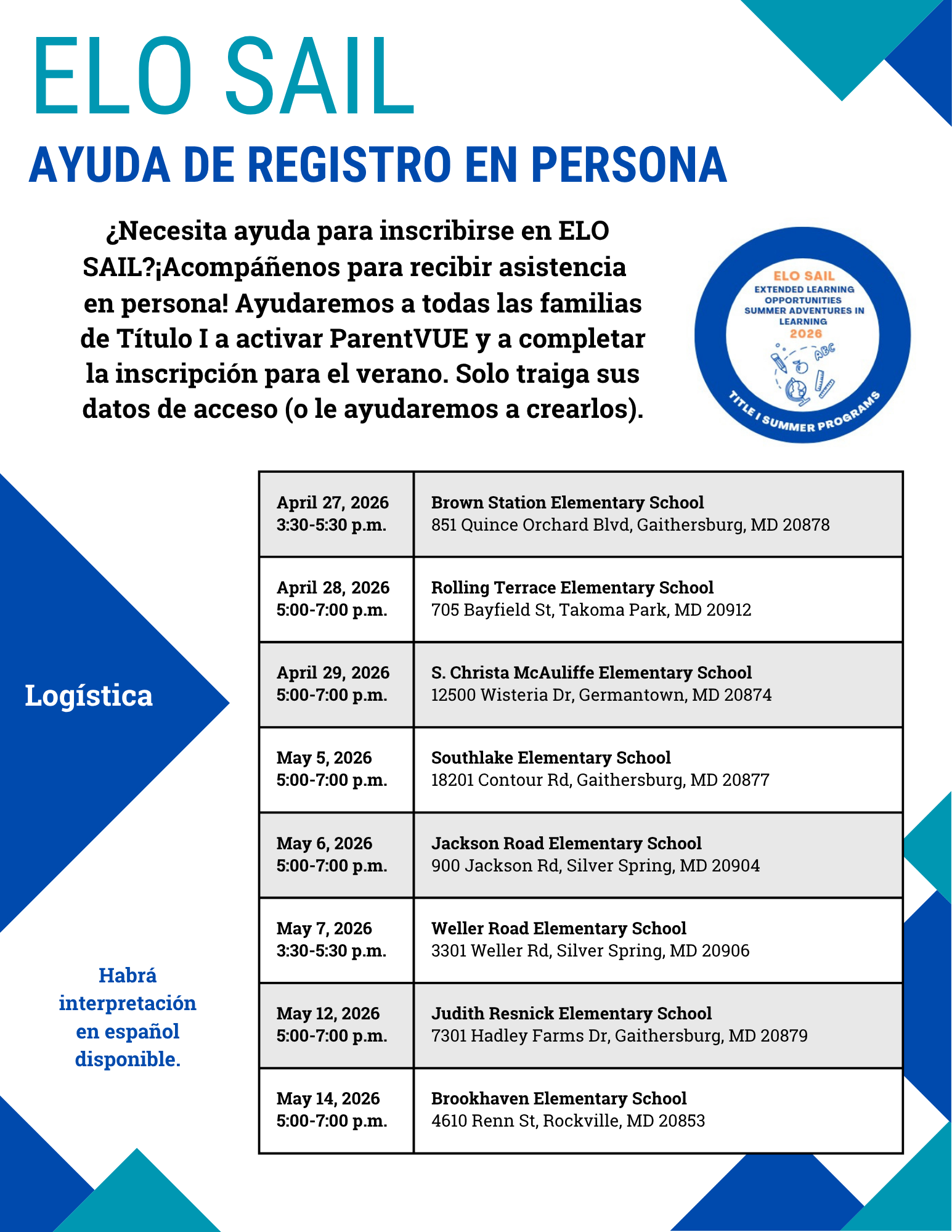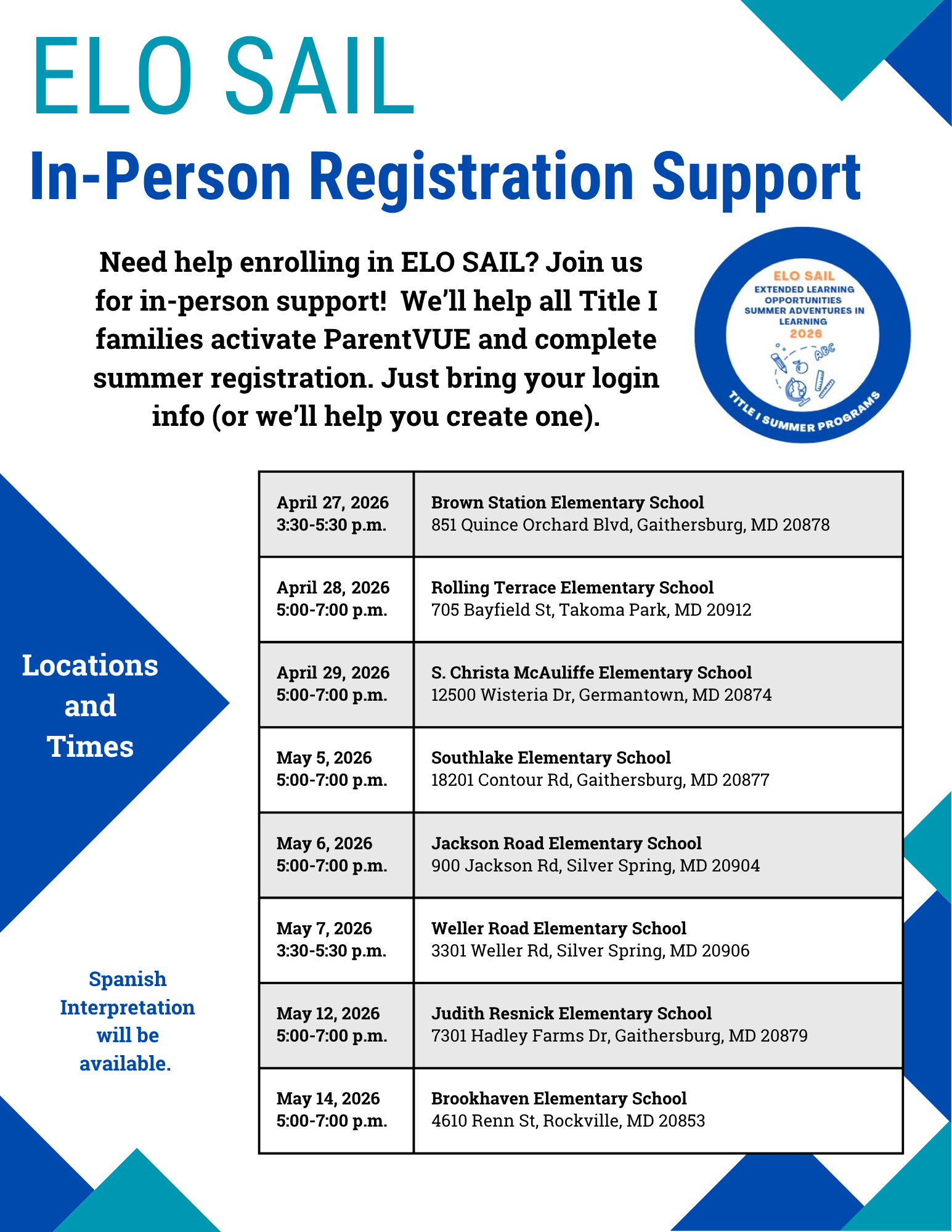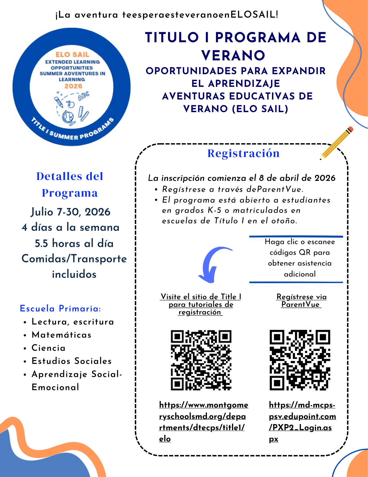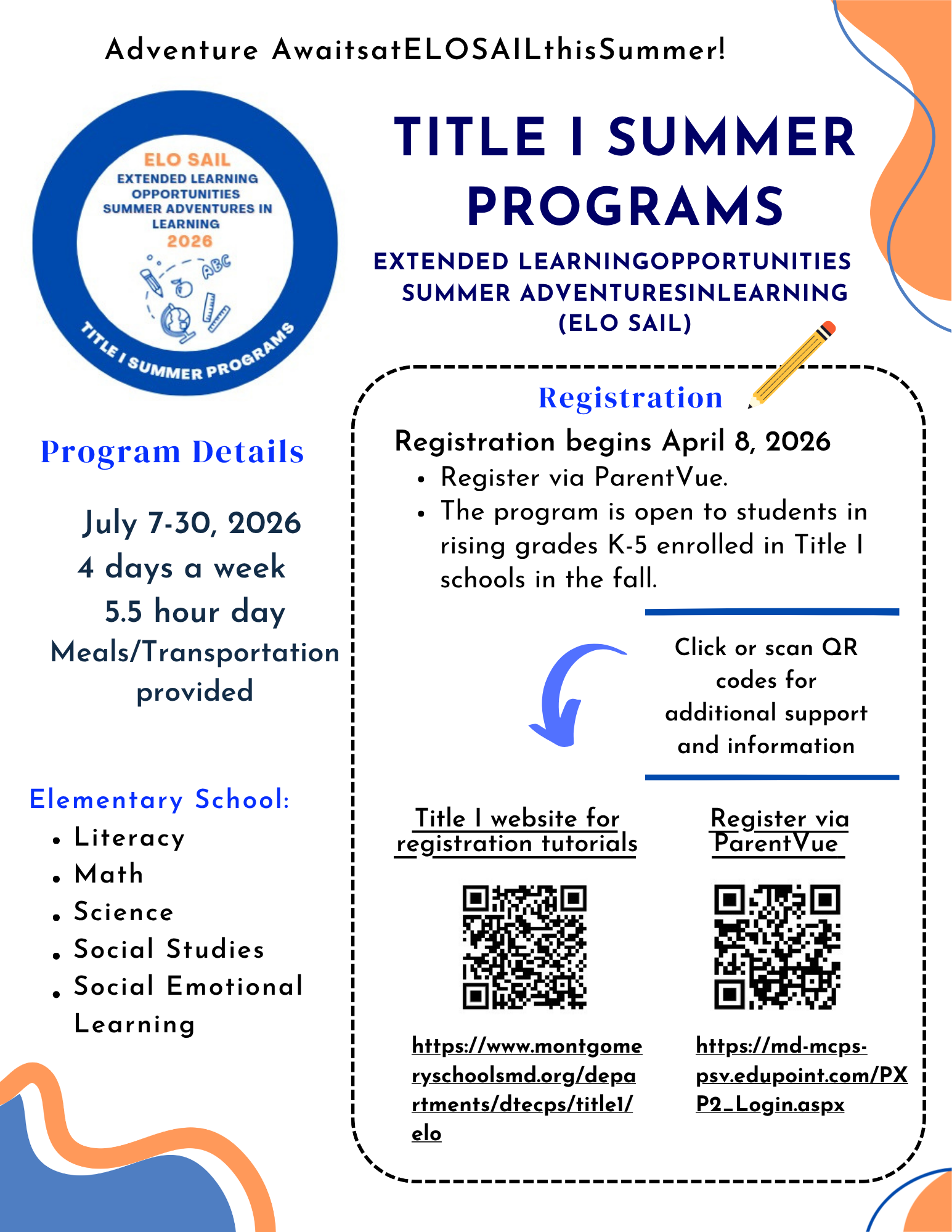 Extended Learning Opportunities Summer Adventures in Learning (ELO SAIL) is a 4-week summer program for rising K–5 students enrolled in Title I schools for the 2026–2027 school year. ELO SAIL will operate a four day program, running from Monday to Thursday each week. ELO SAIL will be offered at your child's Title I school of enrollment. Your school will provide more information in the coming weeks as Montgomery County Public Schools finalizes plans for the summer.