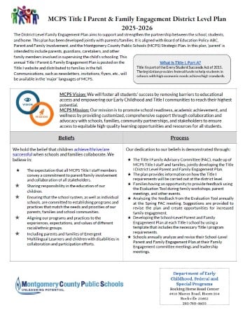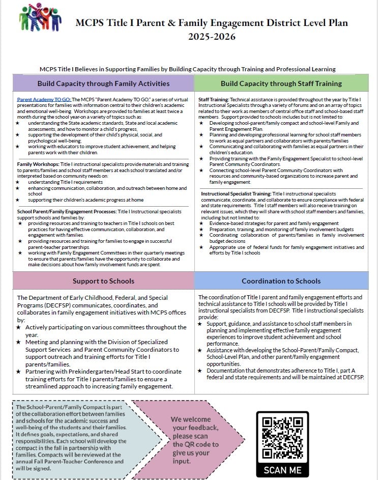 Schools receive Title I funds to provide a comprehensive family engagement program that includes workshops focusing on strategies to help children improve their academic performance. For information about your school’s family engagement activities, contact the school office.