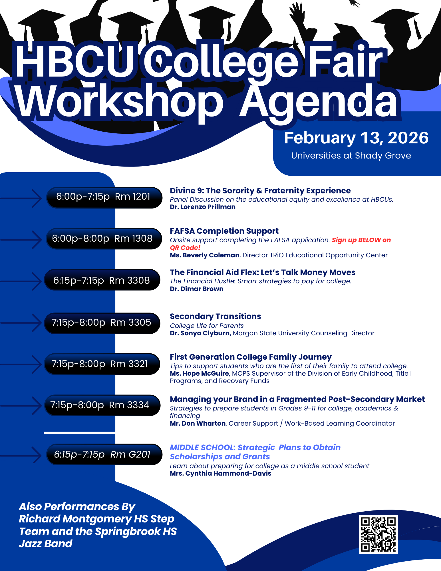 This free in-person event is held at The Universities at Shady Grove will provide students in Grades 8–12 an opportunity to meet representatives from more than 50 HBCUs. Representatives will share information and answer questions from students and parents about admissions, financial aid, testing, majors and much more. The event will also feature a college preparation workshop for middle school students and parents, a discussion on college life, FAFSA completion assistance, scholarship information and more. This event is co-sponsored by Montgomery County Public Schools (MCPS) and the Montgomery County Chapter of the National Association for the Advancement of Colored People (NAACP).