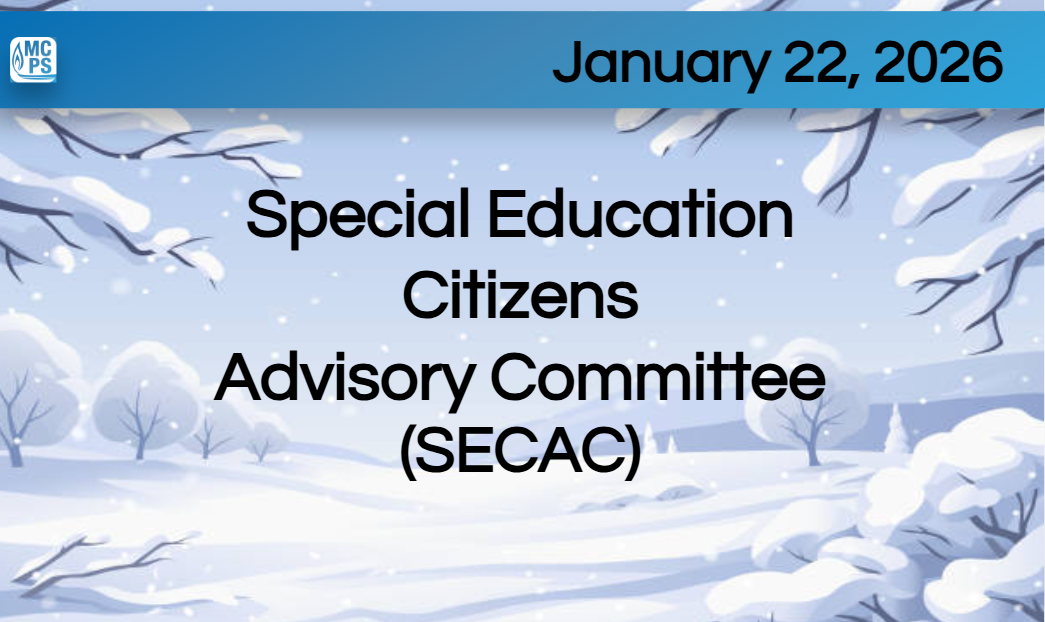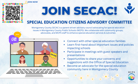 SECAC is comprised of parents/guardians, Montgomery County Public Schools (MCPS) staff members, and representatives of Montgomery County community groups that advocate for students with special needs and serve to advocate for, and advise, the Office of Special Education.