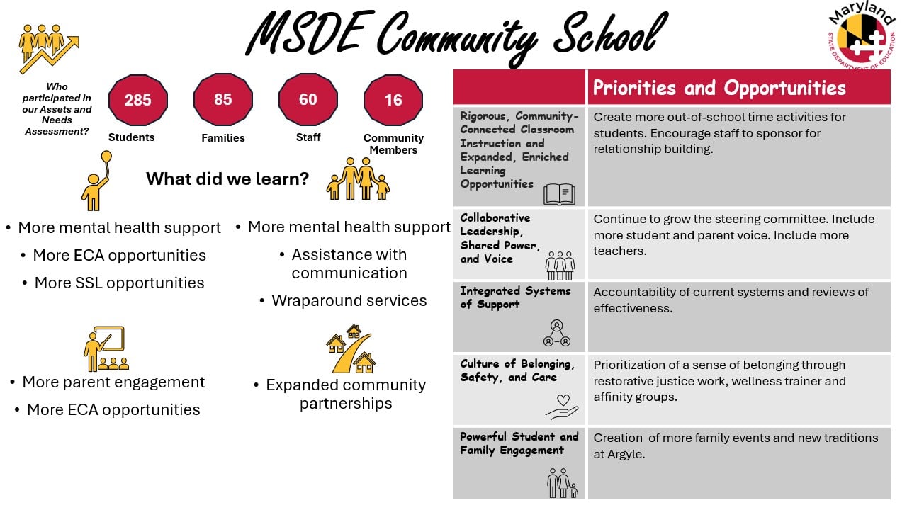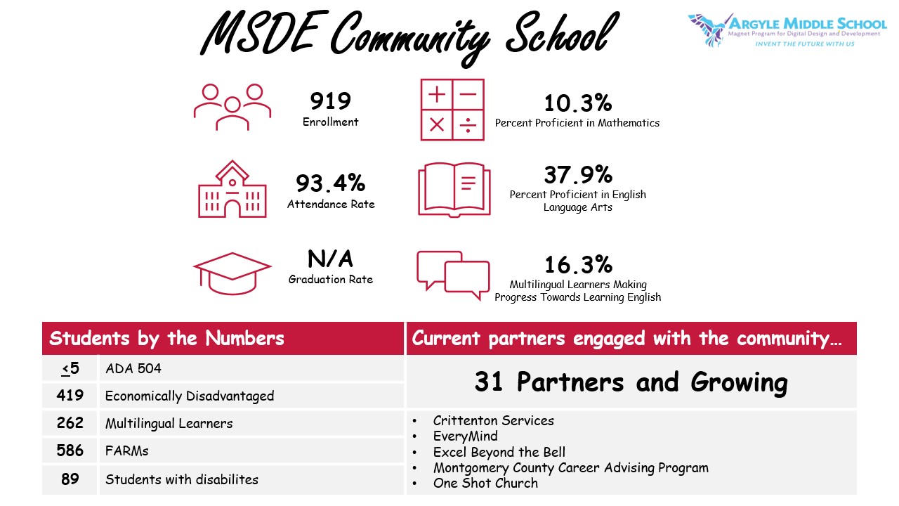 Community Schools will provide the health, mental health, academic, and extracurricular support services needed to flourish. We focus on family and community engagement, culturally responsive relationship building, mental and emotional health, trauma informed practices, restorative practices, and physical health and wellness in addition to MCPS’ quality instruction. Our goal is to promote equity while prioritizing the critical needs of students and caregivers urgent to their wellbeing.