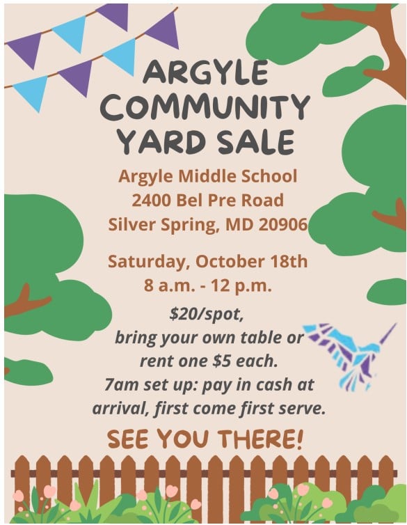 Hey Argyle Family, join us on Saturday, October 18th from 8am-12pm for our Community Yard Sale. Clean out your closets, garages, and storage rooms and bring items to sale by renting a space for $20 and/or table for an additional $5. Hope to see you there!