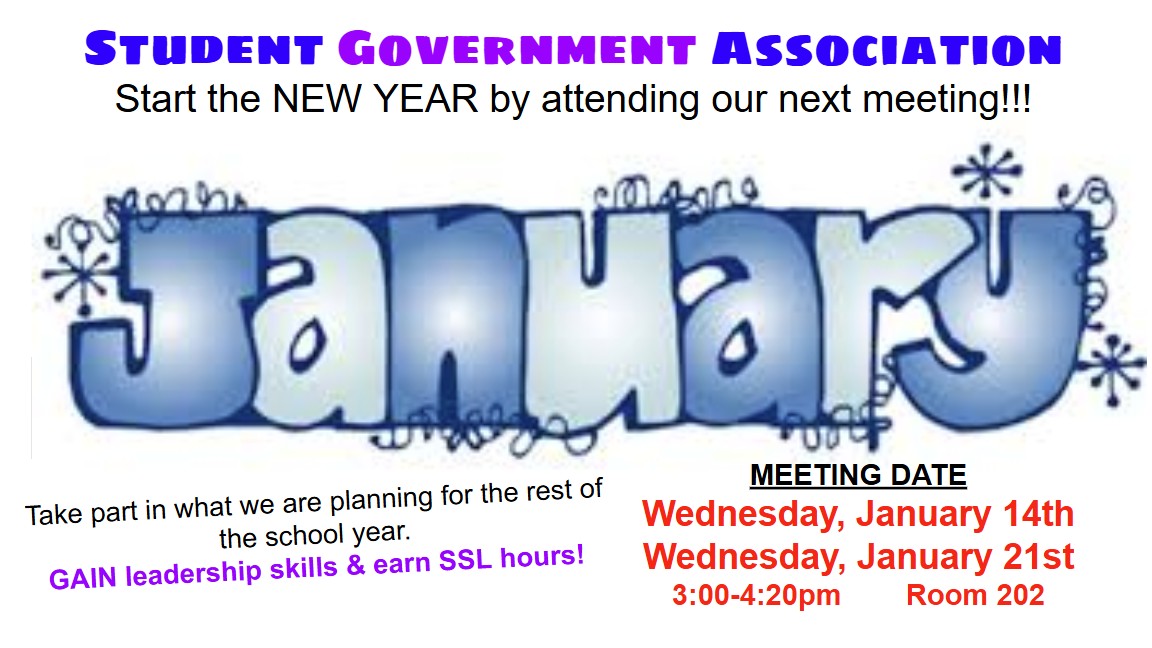 Students, help the SGA blast into the new year with your presence and ideas at our January meetings to ring in the new year of 2026. Have your voices heard and make things happen for Argyle at our January 14th and January 21st SGA meetings after school in room 202. All students are welcome to attend.