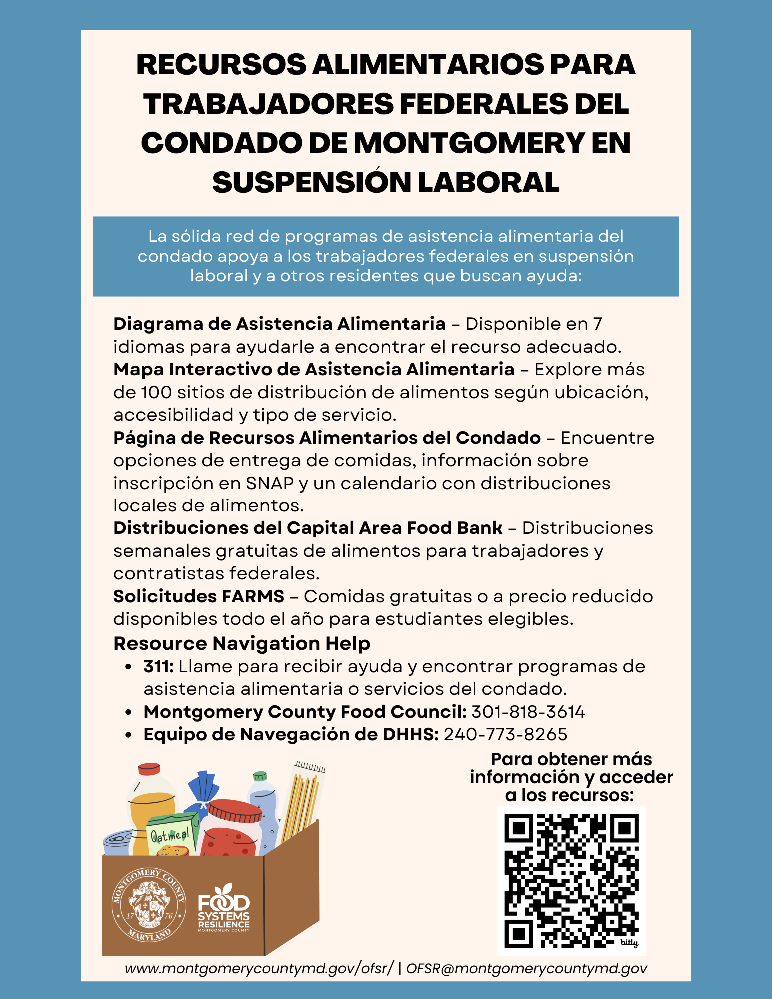 Below is information in English and Spanish about Montgomery County residents getting food assistance during the pause in SNAP Benefits.