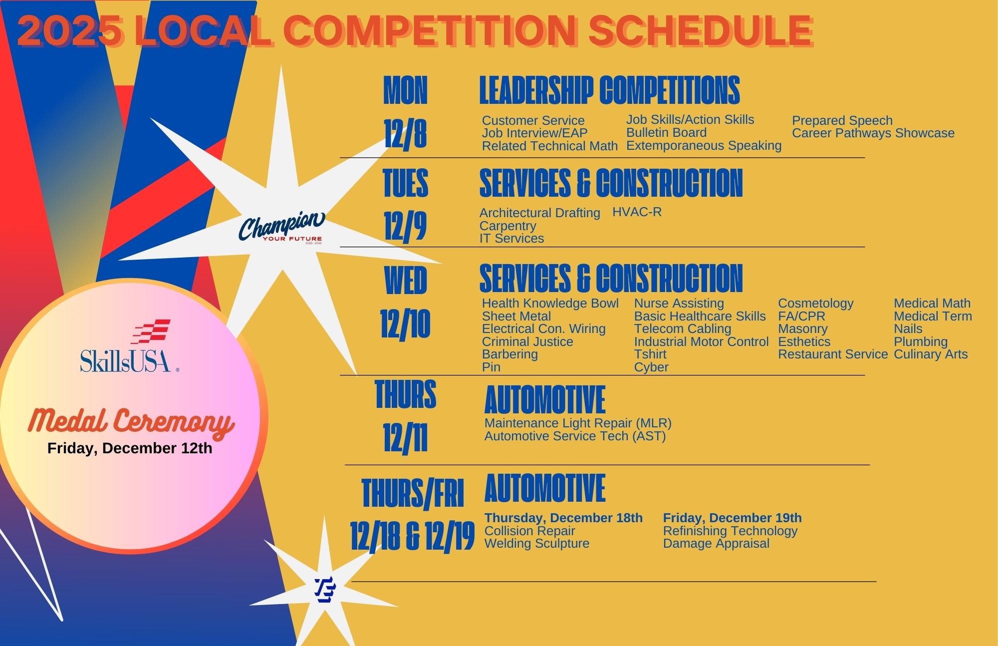 Our SkillsUSA Officers and Program Representatives plan a year of programming that includes opportunities for (1) community service (2) leadership development (3) alumni and industry partner engagement (4) workplace experiences (5) competition and (6) fundraising. You can preview some of our PoW activities for this school year, below.