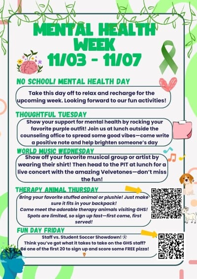 If you're interested in meeting our therapy animals or playing in the student vs. staff soccer game, be sure to sign up using the QR code on the flyer! (Versión español)