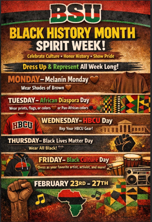 Students and Staff please join our BSU students by participating in the Black History Month Spirit Week!