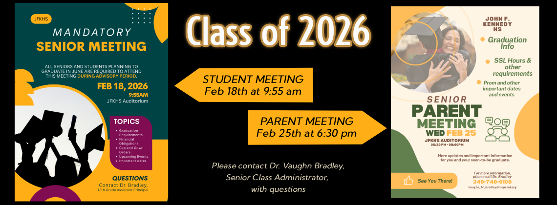 Class of 2026! It is getting real!!! See below for upcoming Senior Class meetings for students (in school) and Parents of Seniors (in the evening). Important information will be shared so don't miss out.
