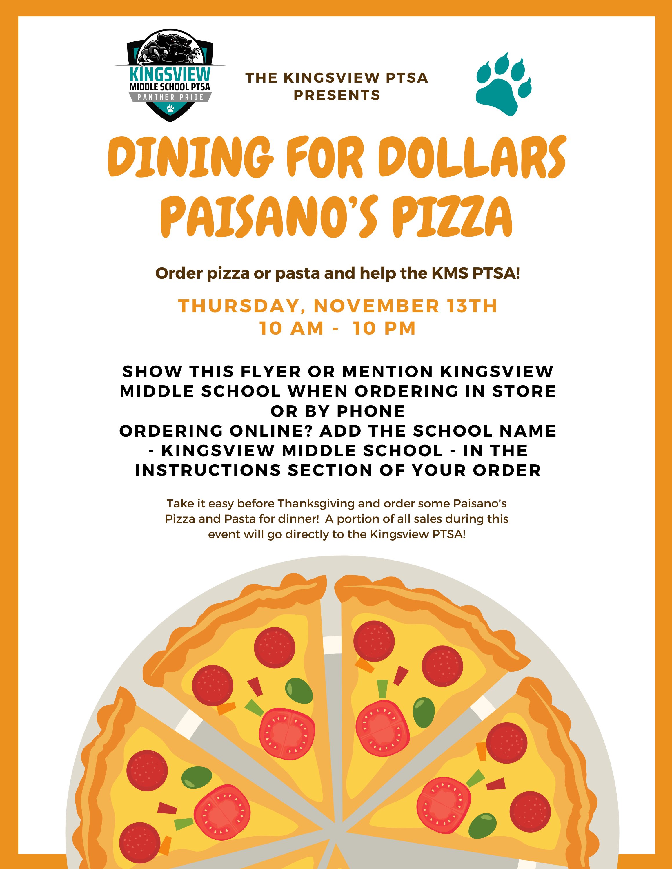 Take a break before Thanksgiving and support the Kingsview PTSA by ordering pizza from Paisano's on Thursday, Nov. 13th.