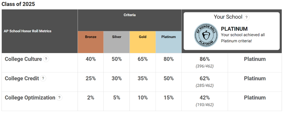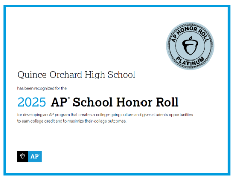 Quince Orchard High School is excited to announce that the QOHS 2025 graduating class received AP School Honor Roll Platinum Honors. The AP School Honor Roll recognizes schools whose AP program delivers results and broadens participation for students.