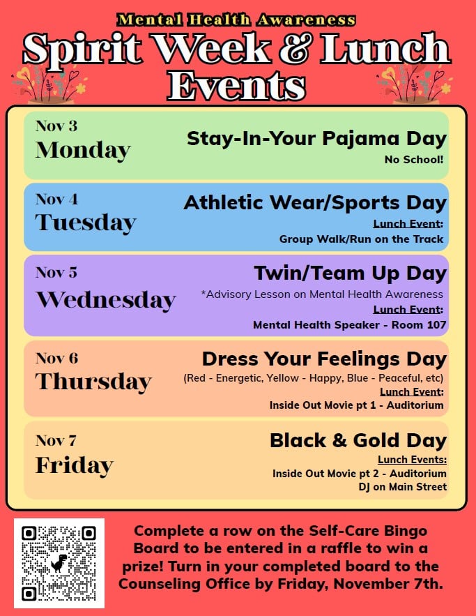 Complete a row on your Self-Care Bingo Board and turn it in to the Counseling Office by Friday, November 7 to be entered in a raffle for a prize! Physical copies can be picked up in the Counseling Office.