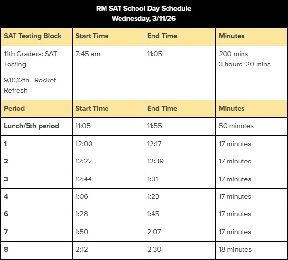 On Wednesday, March 11, 2026, Richard Montgomery High School will offer the SAT free of charge to all Grade 11 students as part of MCPS’ SAT School Day. This SAT testing day is an opportunity for all members of the Class of 2027 to take the SAT during the school day at their local high school.The Make-up Day for the SAT is Wednesday, March 18. We will have a modified bell schedule on March 11 to accommodate testing.