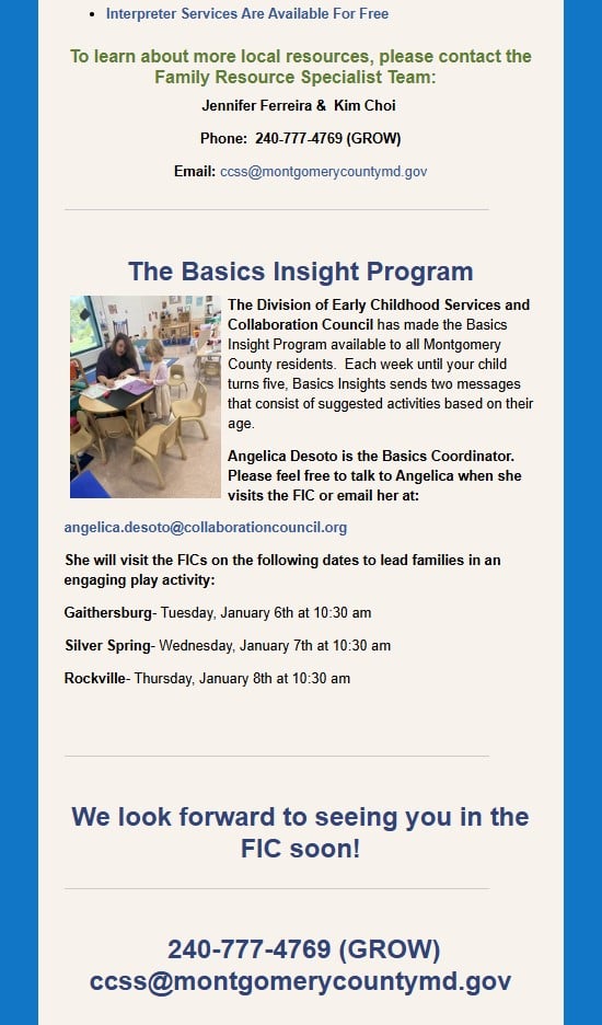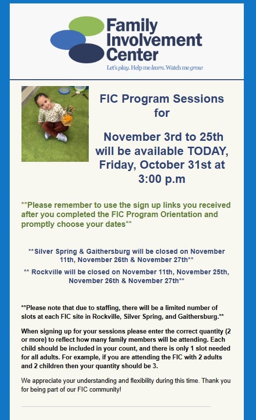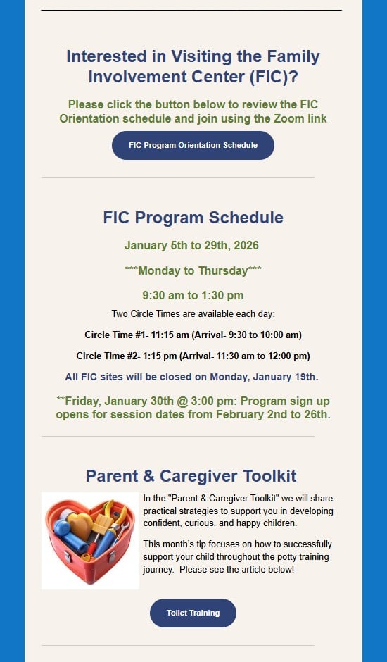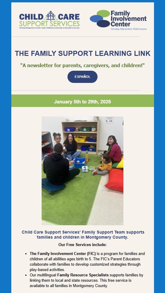 The Family Involvement Center (FIC) at the Up County Early Childhood Center is a free play-based program in an early childhood classroom setting for child(ren) of all abilities ages birth to 5. FIC’s Parent Educator team collaborates with parents & caregivers using play to build on parenting strengths while enhancing the development of all children. Please click here to access our program calendar.