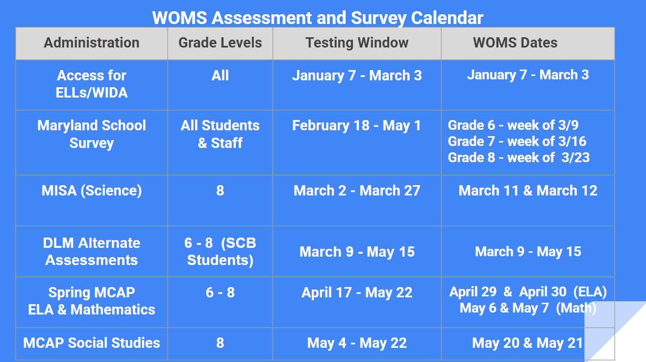 State testing season is on the horizon. Due to the snow days this winter, our superintendent has pushed back the date for all MCAP testing. Therefore the new dates for ELA MCAP are April 29th and 30th and Math MCAP will be on May 6th and 7th. Please help our students come prepared by ensuring they get a good night's sleep and have a charged Chromebook.