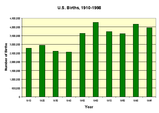 1. Looking at this chart, do you see why statisticians call the 1940s and 1950s (the decades ending in 1950 and 1960) the baby boom? |
